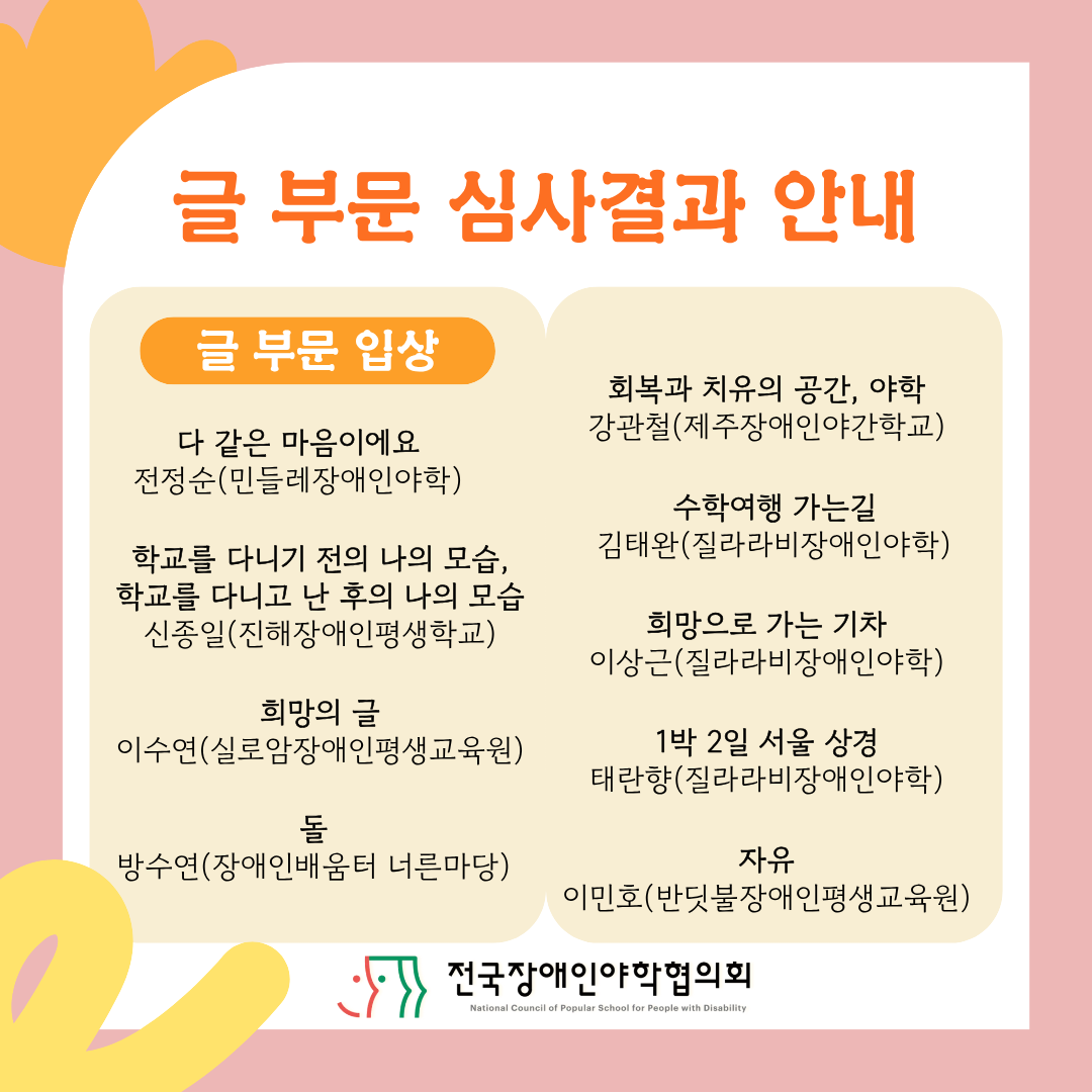 사)전국장애인야학협의회 20주년 장애인평생교육 권리 공모전 "우리는 계속 배우고 싶다" 선정 결과를 아래와 같이 발표합니다.